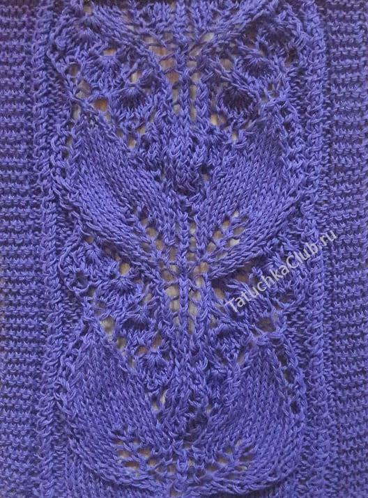 вязать так же, но со шлицей. Для этого на высоте пройм 2 см прибавить в середине 1 п., в следующем ряду разделить работу посередине и обе стороны закончить раздельно. При этом с левого края шлицы не провязывать 3 п. вместе лиц. (середина ажурного узора), а выполнить 1 протяжку (снять 1 п., 1 лиц. и протянуть ее через снятую петлю), с правого края шлицы провязать 2 п. вместе лиц. На высоте шлицы 6 (7) 8 см закрыть для выреза горловины с внутреннего края 8 (9) 9 п. и в каждом 2-м р. 1 х 3,2 х 2 и 3 х 1 п. На высоте выреза 9 см все петли должны быть закрыты.