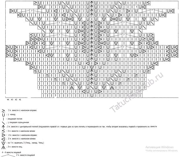 Ажурный узор: вязать по схеме, на которой приведены только лиц. р., в изн. р. Все петли и накиды вязать изн. Повторить 1 раз обозначенные петли,