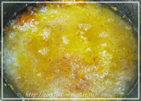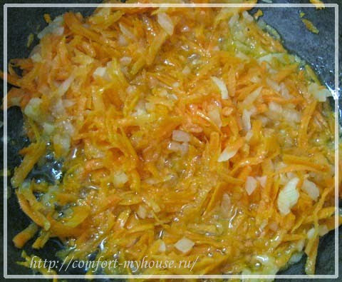 Далее внести морковь и продолжить обжарку зервака. Морковь размягчится и осядет.