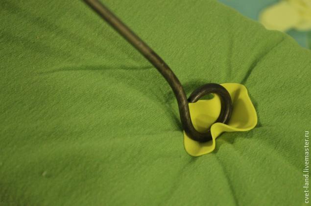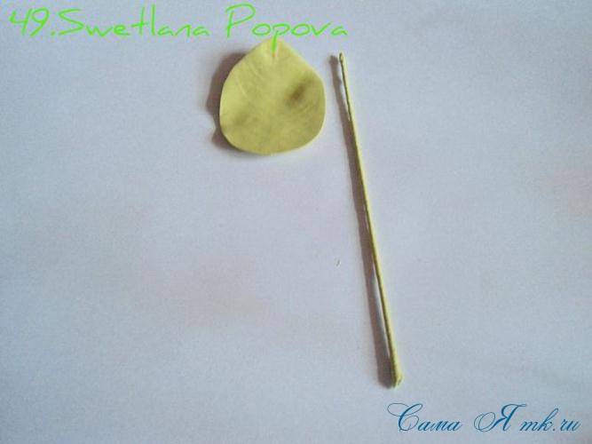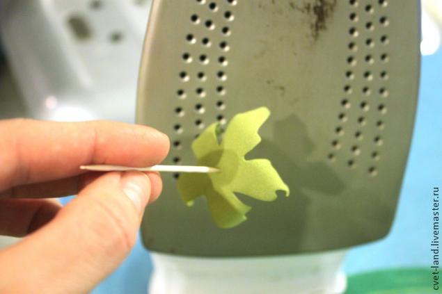 Чашелистик, проткнув посередине зубочисткой, прикладываем на пару секунд к утюгу, чтобы он слегка изогнулся.