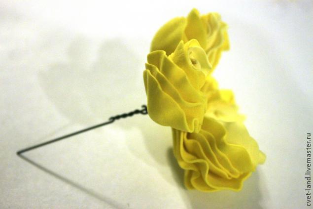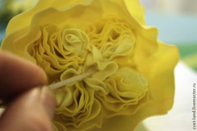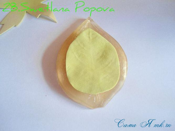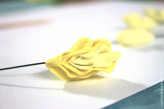 Уже после полной сборки цветка я слегка затонировала края больших лепестков ярко-желтой пастелью.