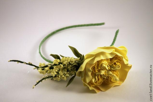 Эта розочка стала частью ободка. К ней я добавила 3 небольшие веточки, о создании таких я рассказывала в прошлом мастер-классе . Я люблю ободки из металлической основы (ведь так обидно, когда любимый пластмассовый ободок ломается), которые обматываю атласной лентой.