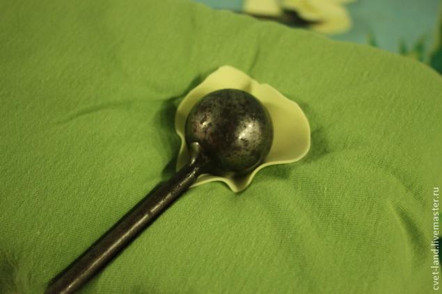 Все, кроме 12 самых больших лепестков, на пару секунд прикладываем к утюгу, быстро, пока лепесток не остыл, кладем на толстую губку и придавливаем крючком.