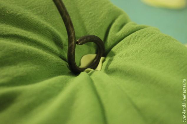 - Сердцевину выполняем шариком из фольги, окрашенного под цвет материала и приклеиваем к нему стебель из проволоки.