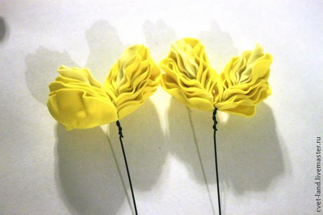Длинные стебельки нам не нужны, обернув полосочкой фома, фиксируем (клеим) оба стебелька и откусываем кусачками лишнее.