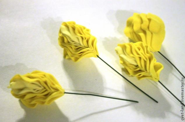 - Скручиваем каждый лепесток и придаем дугообразную форму. Для крупных лепестков используем шарик, натягивая фоамиран на него.
