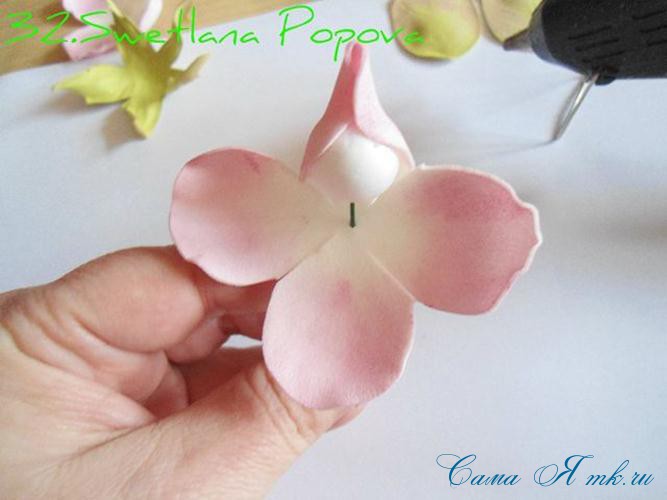 Приклейте пять пачек лепестков, равномерно распределив их вокруг тычинок. Я пользуюсь горячим клеем. Клей в цветоделии.