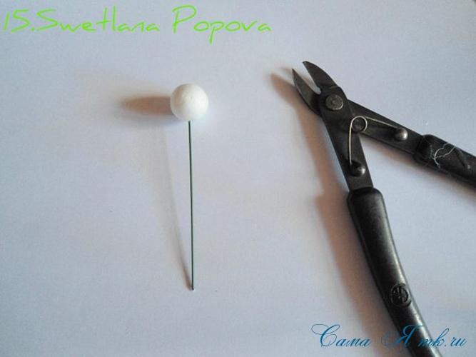 Берем пенопластовый шарик (диаметр примерно 1,5 см) и прокалываем его сверху и тянем за проволоку, петелька должна утопиться в шарике.