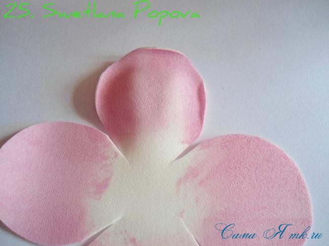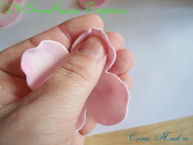Складываем лепесток, протираем между пальчиками, растягиваем середину, придаём слабую волну кончикам и подкручиваем их назад.