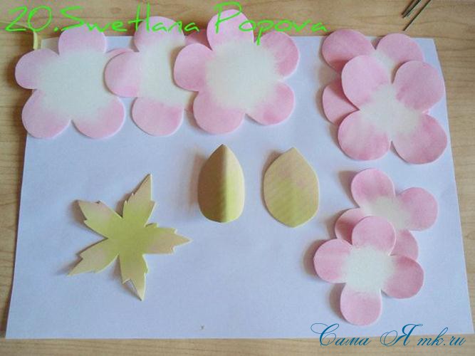 У нас получилось: 2 венчика -а; 2 венчика — б; 3 венчика — в; подклейка; 2 полосочки фома и 2 листочка произвольной формы.