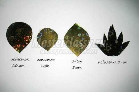 - Нарезаем по шаблону 3 типоразмера лепестков из фоамирана (высота*ширина 5*4 см – 30 шт.; 5*6 см – 20 шт.; 6*8 см – 10 шт.).