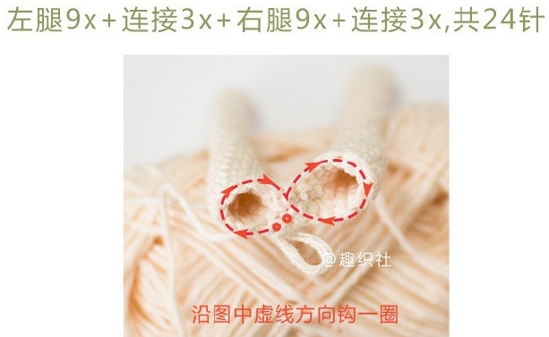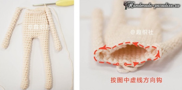 3 воздушные петли между ножками, соединить, дальше вязать по кругу: