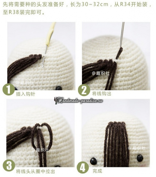 Начинаем присоединять к голове нити как бахрому, начиная от макушки и двигаясь вниз. Крючок вводим по направлению к макушке, сложенную пополам волосинку цепляем за серединку, протягиваем через голову, а потом цепляем обе волосинки и протягиваем через петельку и затягиваем. Так заполняем всю голову, опираясь на естественную линию волос, у меня волос много поэтому я делала сзади до середины уха.