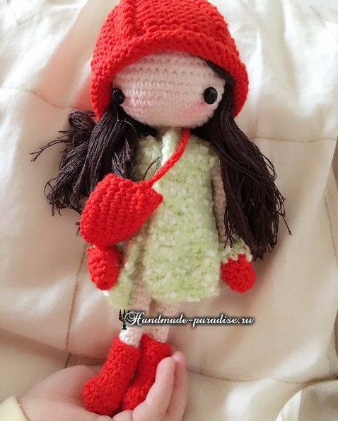 На этом этапе мы пришиваем голову к туловищу (если необходимо), пришиваем руки и ноги. Руки пришиваем примерно между 4 и 5 рядом туловища. Ноги пришиваем примерно между 22 и 23 рядом туловища, тогда кукла будет сидеть. Делаем кукле прическу, украшаем туфельки и платьице, оформляем лицо. В самый последний момент я приклеиваю глаза и вышиваю рот, вот тогда рождается девочка и имя ей.