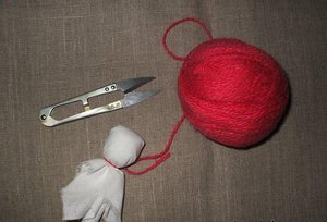 Далее, нам понадобятся крепкие нитки. Для куклы годятся только белые или красные нитки. Исключением является тот случай, когда вся кукла делается из мешковины — тогда можно мотать нитью, выдернутой из ткани.