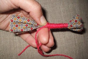 - Образовавшийся элемент туго перемотать нитками. Для обмотки можно использовать белую или любую светлую ткань.