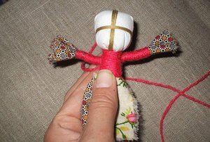 Обматывать этот валик нитью начинаем с середины валика. Идем нитью вверх, потом вниз, потом возвращаемся к середине; и здесь, в середине столбика, завязываем тройной узел. Он как бы символизирует пуповину.
