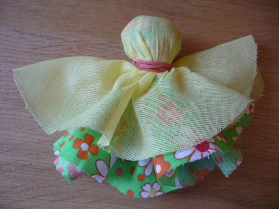 В первую очередь нужно выложить на столе необходимые для работы материалы: для головы — отрез мягкой ткани, например, из пеленки, полотенца, старой наволочки; для рук изделия и нижней юбки — ткань из ситца. Можно использовать детское платье, распашонку и т. д.