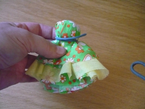 6. Кругом из ткани другого цвета обхватываем первый слой платья и также обматываем резинкой.