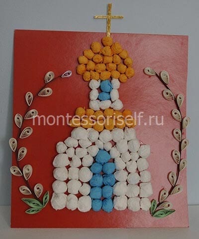Приклеиваем полоски коричневой бумаги. Располагаем по краям бумажные капельки — у нас должны получиться очень нежные веточки вербы вокруг храма. Верхушку храма украшаем крестом из золотистой бумаги. Наш прекрасный белостенный храм — готов!