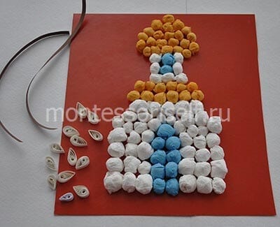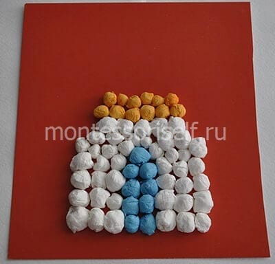 Катаем шарики белого, голубого и оранжевого цвета. Каждый шарик обмакиваем в клей и приклеиваем на плотный картон.