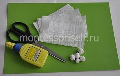 Для того, чтобы сделать такую поделку нам понадобится тонкая бумага. Очень хорошо подойдет обычная салфетка. Нарезаем бумагу на достаточно крупные полоски, наносим на нее жидкий клей и скатываем в плотные шарики.