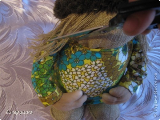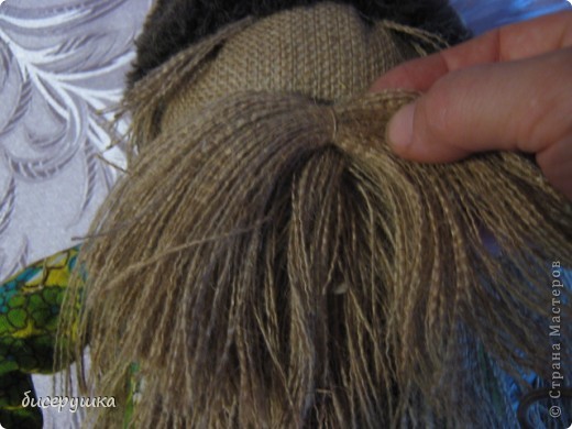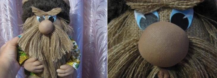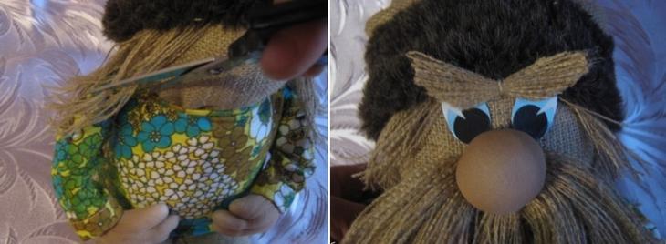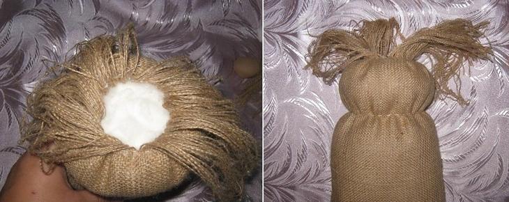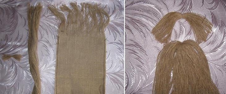 Сшиваем мешковину для туловища и головы домового и делаем волосы и бороду