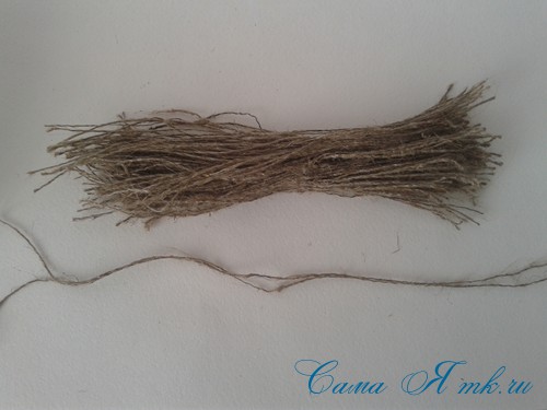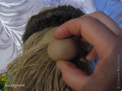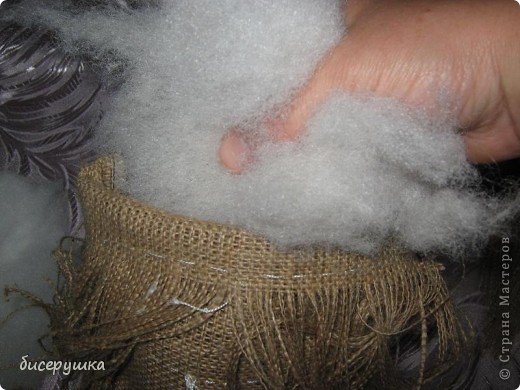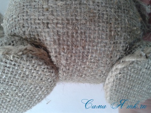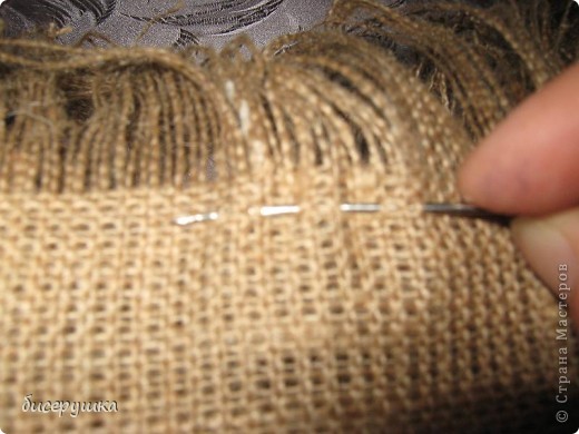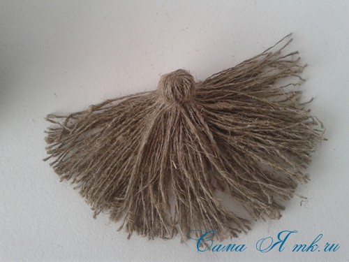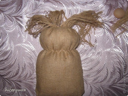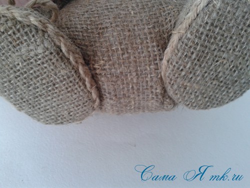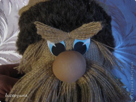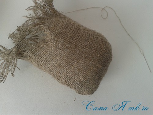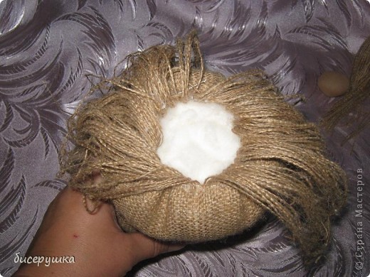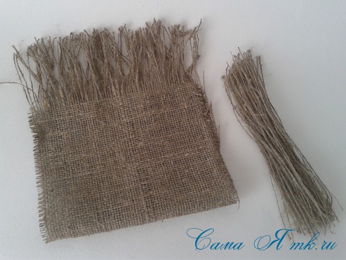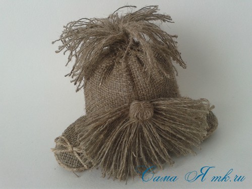 Из вытянутых нитей мешковины делаем бороду: связываем посередине, а затем по кругу, оформляя носик. Выравниваем край.