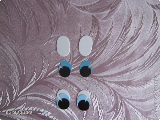 - Для глазок вырезаем заготовки из пластика и цветной бумаги