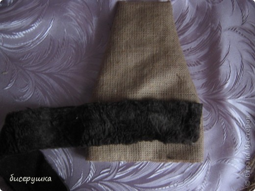 Приступаем к изготовлению головного убора. С мешковины вырезаем прямоугольник, складываем пополам и сшиваем наискосок к складке, чтобы верхняя часть шапки была меньше. Лишнее обрезаем. По краю шапки пришиваем полоску искуссвенного меха , шириной 7-8 см.