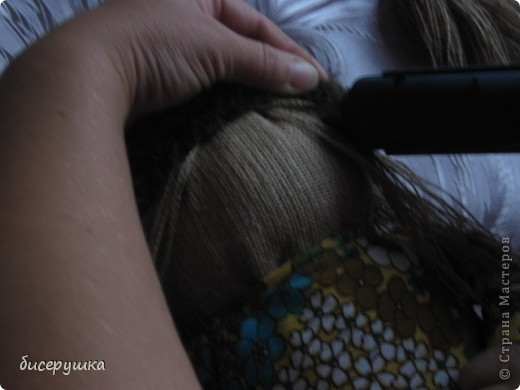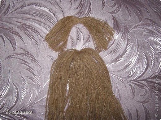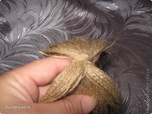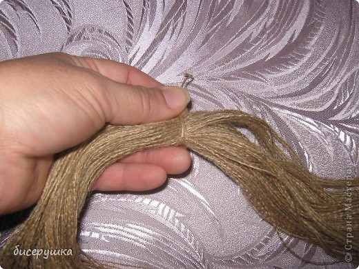 Изготовление бороды: пучок нитей первязываем такою же ниточкой посредине.