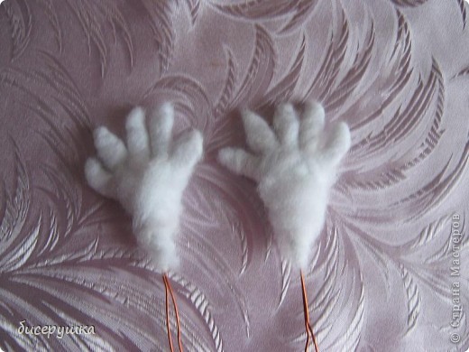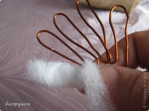 - Проволочные заготовки для ручек тщательно обматываем синтепоном