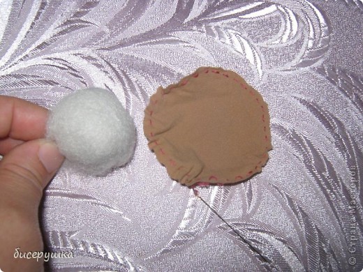 Изготовление носа: вырезаем с капроновой колготки кружок(у меня он 5-6 см. в диаметре), промётывем ниткой по краю, немножко стягиваем и вставляем шарик из синтепона.