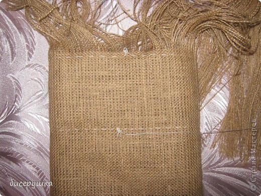 Итак, приступаем к работе: нам понадобится мешковина или новый мешок, который мы распорим и сделаем заготовки для домовёнка . Для туловища с головой вырезаем прямоугольник (у меня он 20 х 85 см.), сложим его пополам и прошиваем боковые швы, заокруглив немножко внизу, вытянуть вверху нитки сантиметров 14 для формирования волос, а те, что вытянули пойдут на изготовление усов. С остальной мешковины нужно наторочить нитки подлинее для формирования бороды , примерно 45 см. , и ещё нужно сделать заготовочку для бровей, где-то 7-8 см.