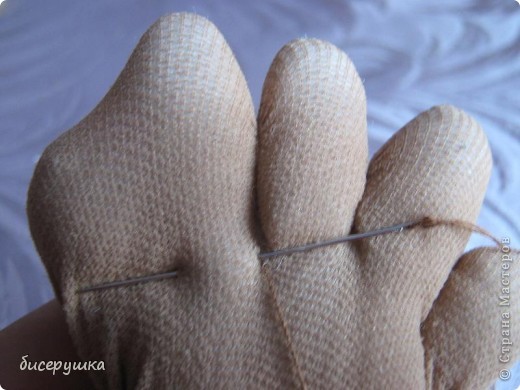 - Берем нитку с иголкой и прошиваем соединения между пальчиками