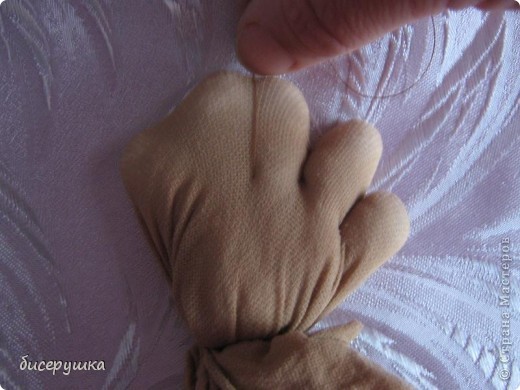- Обтягиваем капроном кисть и фиксируем ткань, перевязав её ниткой на запястье