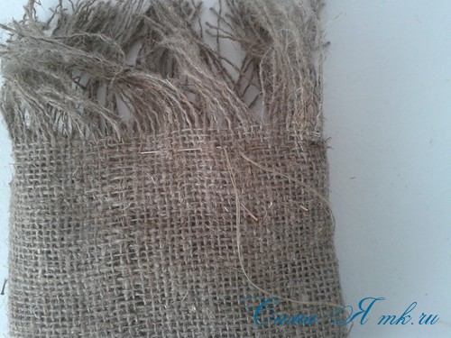 Из мешковины вырезаем прямоугольник, размер которого зависит от размеры игрушки. У меня получился 18х45 см.