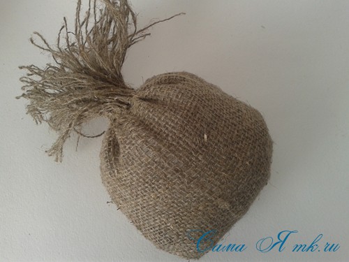 Шов оформляем косичкой шпагата и на горячий клей подклеиваем их к нашему мешочку.