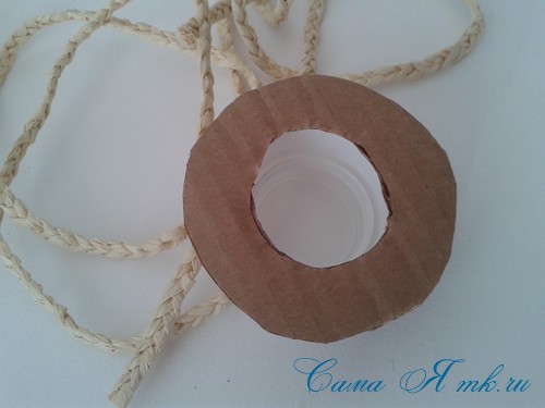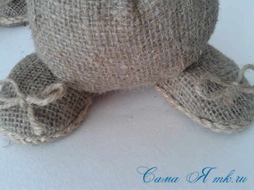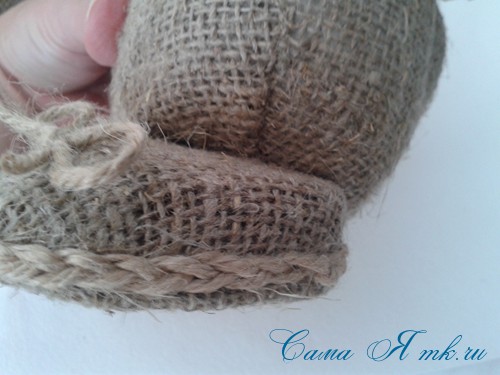 С ниток мешковины сплести косичку(я брала 12 ниточек) и обклеить сшитый стык лаптей, концы косички приклеить посредине, дабы их уже в готовом изделии не было видно.