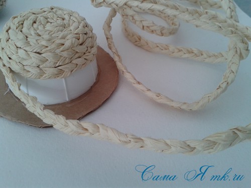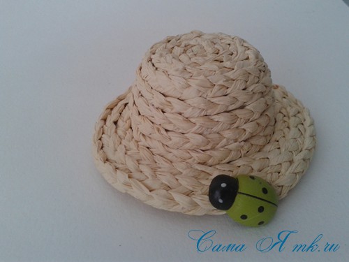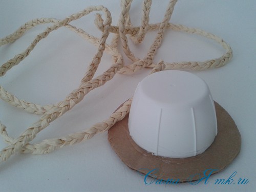 Шляпка также сделана из подручных материалов. Оформлена косичкой из бумажного шпагата.