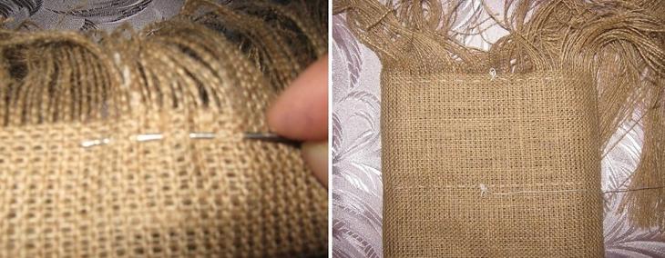 Складываем заготовку пополам и, отступив от края мешковины 1.5 см, прошиваем боковые края вручную или на машинке, закругляя нижние уголки.