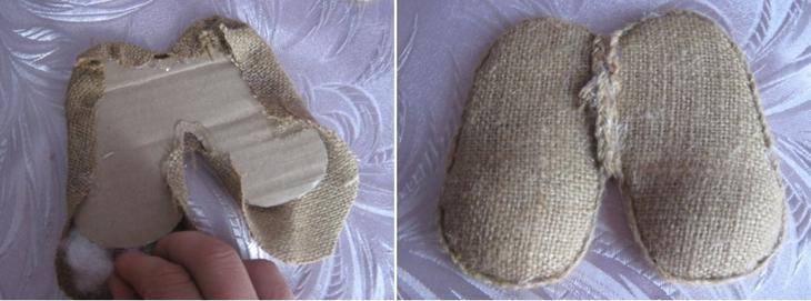 - Выкраиваем из мешковины две таких же детали, чуть большего размера. Одна из них просто приклеивается к картону, вторая набивается синтепоном и приклеивается к картону только после этого