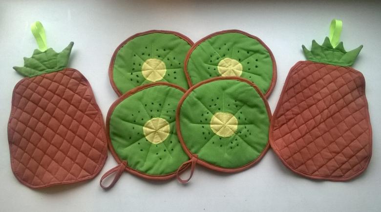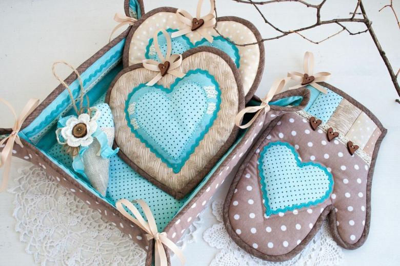 - наборы из прихваток, кухонных полотенец и чехлов на табурет, выполненные в едином стиле.