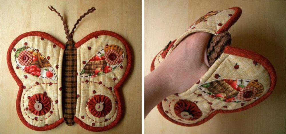 Еще одним вариантом прихваток, по принципу использования напоминающих варежки, являются бабочки. Необычные по расцветке и красиво украшенные кухонные атрибуты не только уберегут от ожогов, но и украсят комнату. Поверьте, вам еще больше захочется приготовить что-нибудь вкусненькое и порадовать домашней едой своих родных.