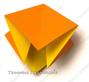 Если вы складывали лист бумаги, соблюдая наши рекомендации по лицевым и изнаночным сторонам, то следующая фигурка сложится очень просто. Берем квадрат за противоположные углы и начинаем их прятать внутрь