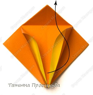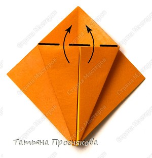 Продолжаем дальше. Крайние стороны сгибаем к центральной линии, как показано стрелочками на фото