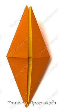 Верхнюю часть фигуры складываем к центральной линии аналогичным образом. Имеем базовую фигуру «Рыба». «Закрываем» её вдоль длинной оси так, чтобы все складки оказались внутри. Вновь расправляем, после чего поднимаем более длинную часть вверх. Это будет шея, которую, сделав обратную складку, нам нужно вставить в середину туловища.