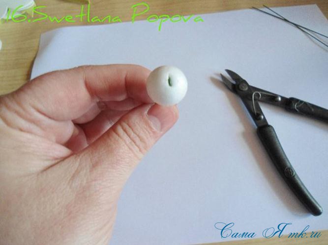 Берем пенопластовый шарик (диаметр примерно 1,5 см) и прокалываем его сверху и тянем за проволоку, петелька должна утопиться в шарике.