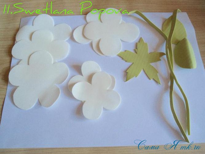У нас получилось: 2 венчика -а; 2 венчика — б; 3 венчика — в; подклейка; 2 полосочки фома и 2 листочка произвольной формы.