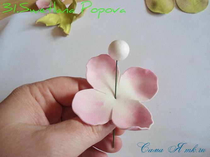 И, наконец, надет на проволоку последний венчик, можно прищипнуть лепестки, зажав пальцами.